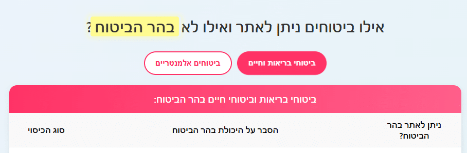 טבלת ביטוחים בעיצוב מודרני אילו ביטוחים ניתן לאתר ואילו לא בהר הביטוח? ביטוחי בריאות וחיים ביטוחים אלמנטריים ביטוחי בריאות וביטוחי חיים בהר הביטוח: ניתן לאתר בהר הביטוח? הסבר על היכולת בהר הביטוח סוג הכיסוי ניתן לאתר הר הביטוח מציג את כל סוגי הכיסויים העיקריים: פרטי, קולקטיבי ושירותי בריאות משלימים ביטוח סיעודי ניתן לאתר המערכת מציגה […]